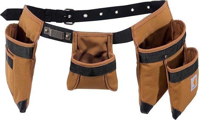The Carhartt padded tool belt is simple, tough, and built to work — no fancy nonsense, just a rugged belt that holds what you need and stays put. The padding keeps it comfortable when you’re loaded down, the pockets are sturdy, and the Carhartt canvas takes a beating without fraying or folding. It’s lighter than the big rigs but still tough enough for everyday jobsite abuse.